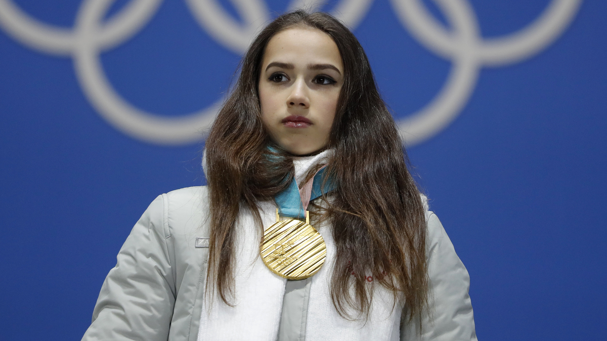 Gold medalist figure skater Alina Zagitova, an Olympic Athlete from Russia, heard the Olympics’ anthem as she stood on the podium for her medal ceremony.