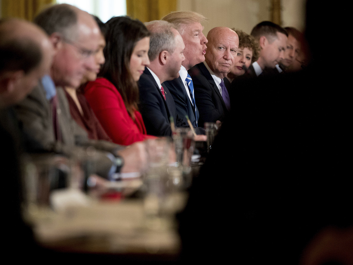 President Trump speaks to the Republican House whip team about the proposed health bill. Trump highlighted Rep Elise Stefanik R-NY (in the foreground) as the youngest woman ever elected to congress.