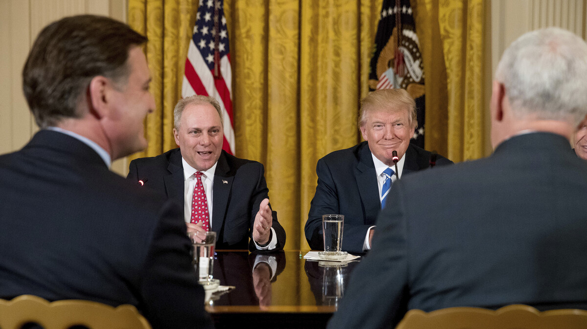 President Donald Trump listens as House Majority Whip Steve Scalise of La. speaks during a meeting with the Republican House whip team about the proposed health bill.