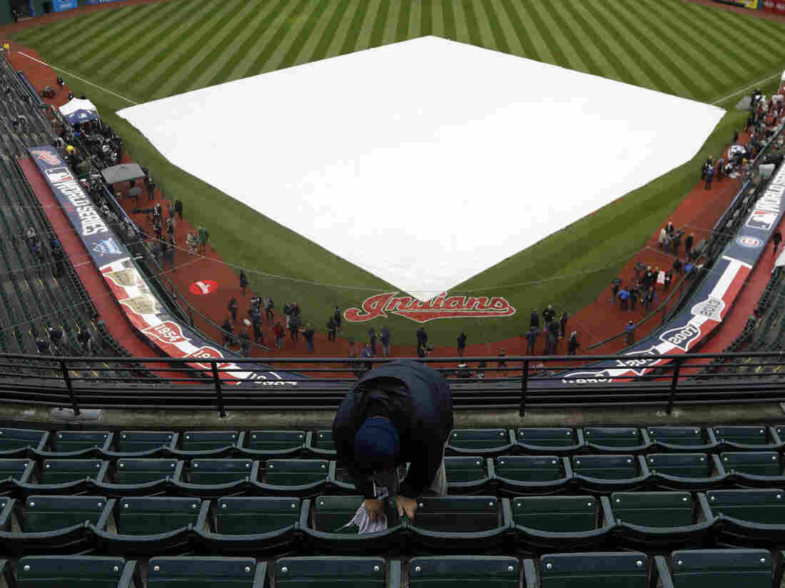 A worker wipes down the rain covered seats at Progressive Field in Cleveland before Game 2 of the World Series between the Cleveland Indians and the Chicago Cubs. Matt Slocum/AP hide caption