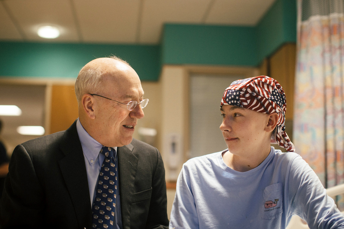 Dr. Kurt Newman visits with 14-year-old Jack Pessaud, who’s undergoing treatment for a cancerous tumor in his knee at Children’s National Health System in Washington, D.C.