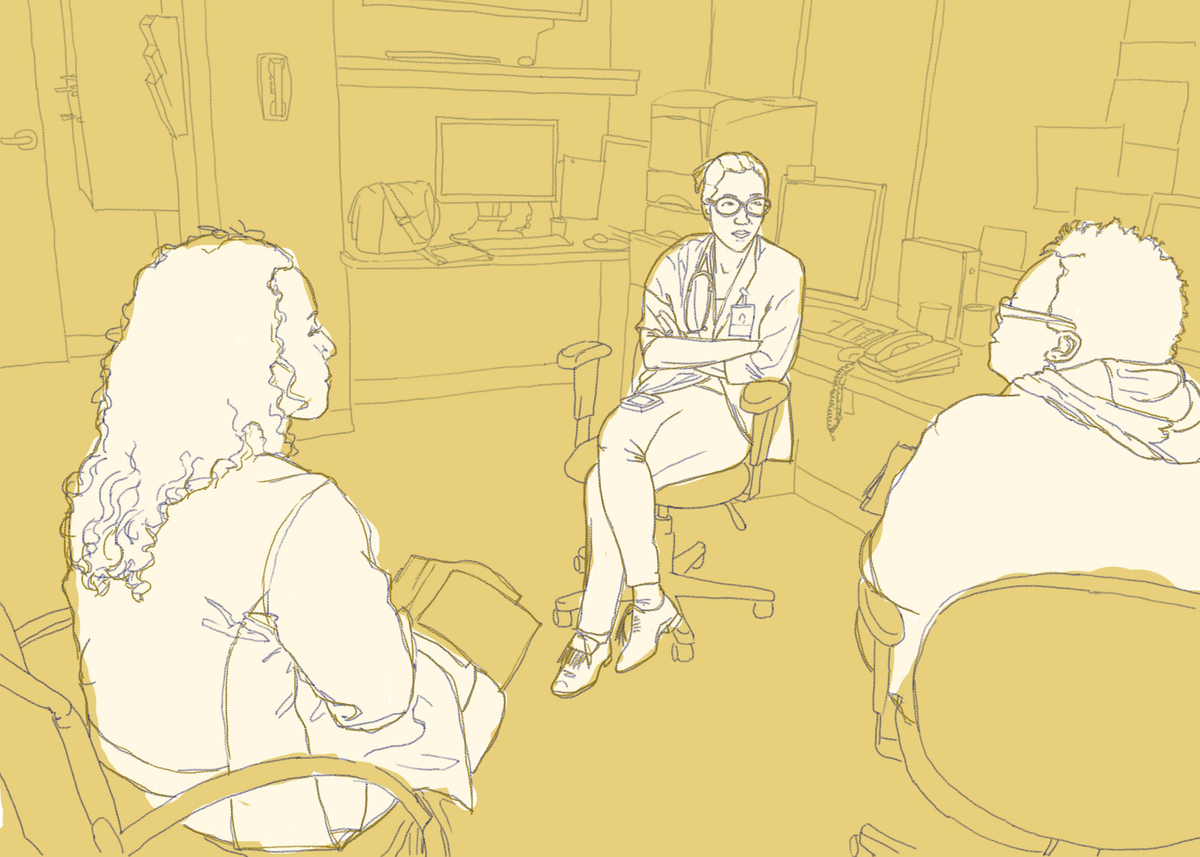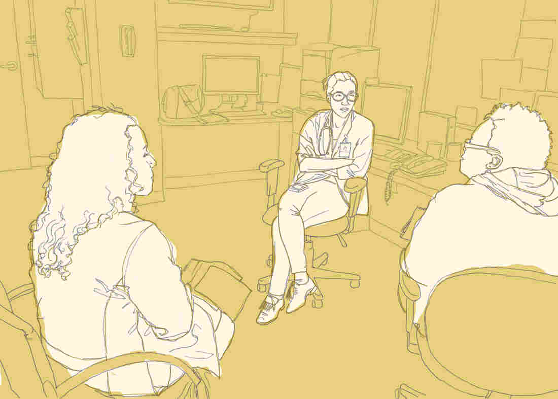 Doctors Lisa Puglisi and Emily Wang talk with a community health worker about the patients they’re about to see at a clinic for ex-offenders in New Haven, Conn. Rae Ellen Bichell/NPR hide caption