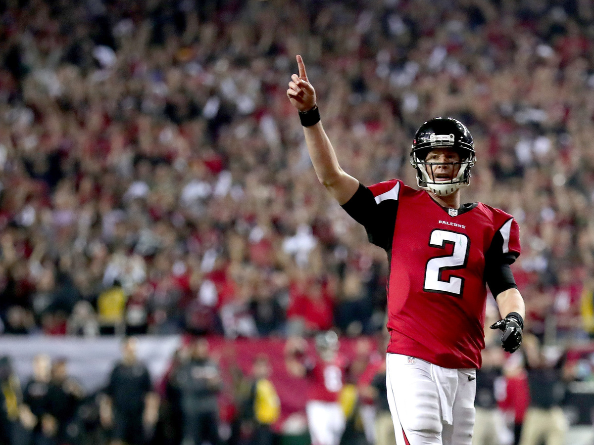 Matt Ryan of the Atlanta Falcons — depicted here with one finger raised in the NFC Championship Game — helpfully illustrates an important number: the total Super Bowls the Falcons organization will have won, if they win Sunday. Tom Pennington/Getty Images hide caption