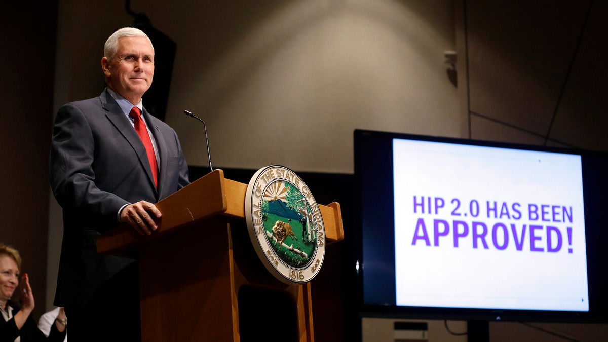 Indiana Gov. Mike Pence announces in 2015 that the federal Centers for Medicaid and Medicare Services has approved the state’s waiver request to expand Medicaid coverage. Michael Conroy/AP hide caption